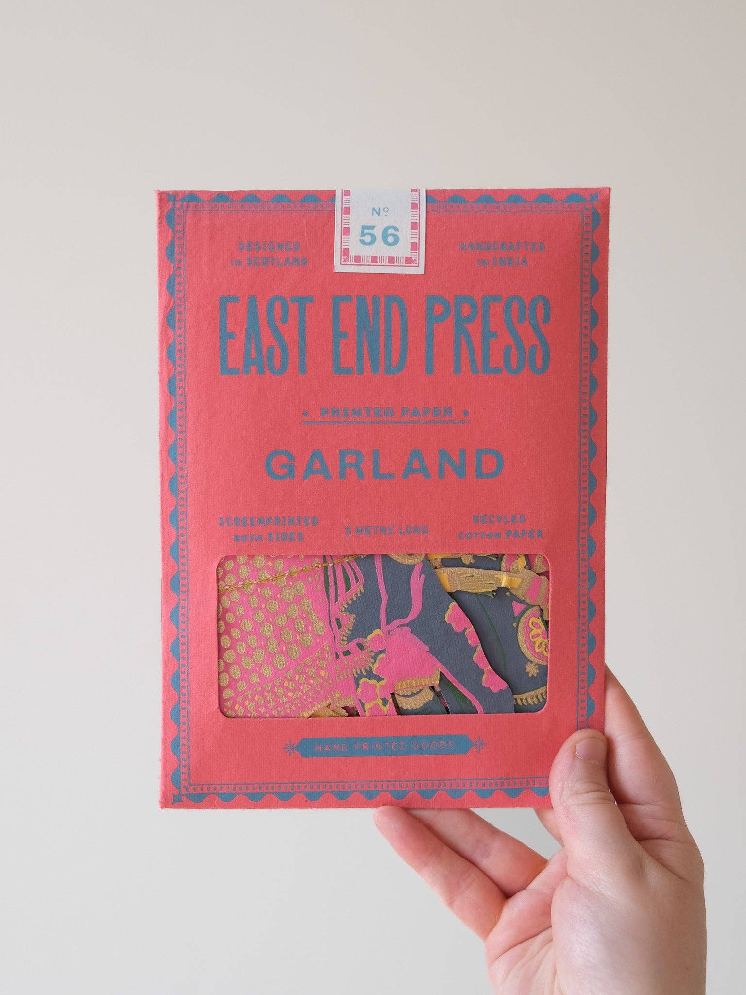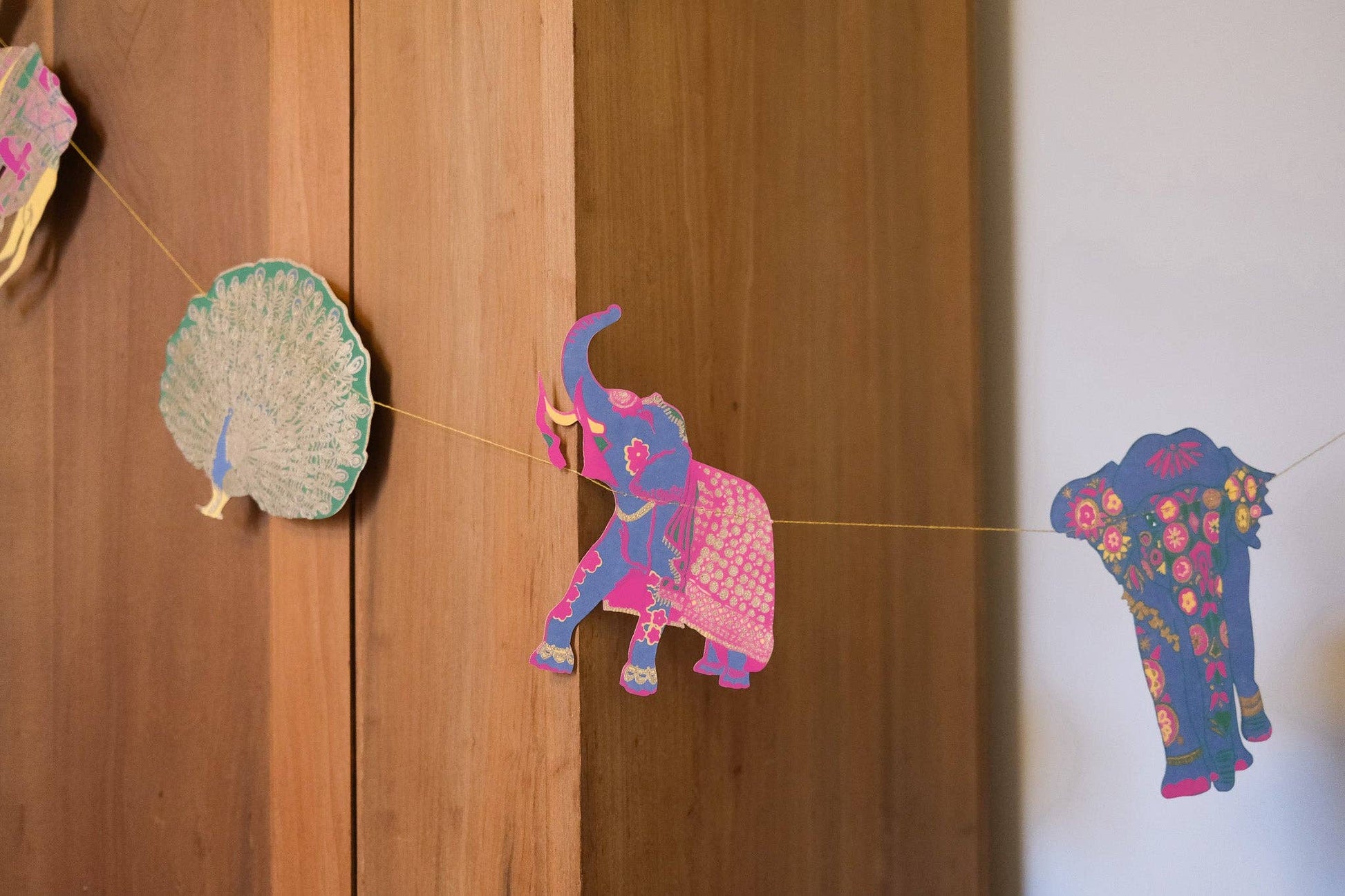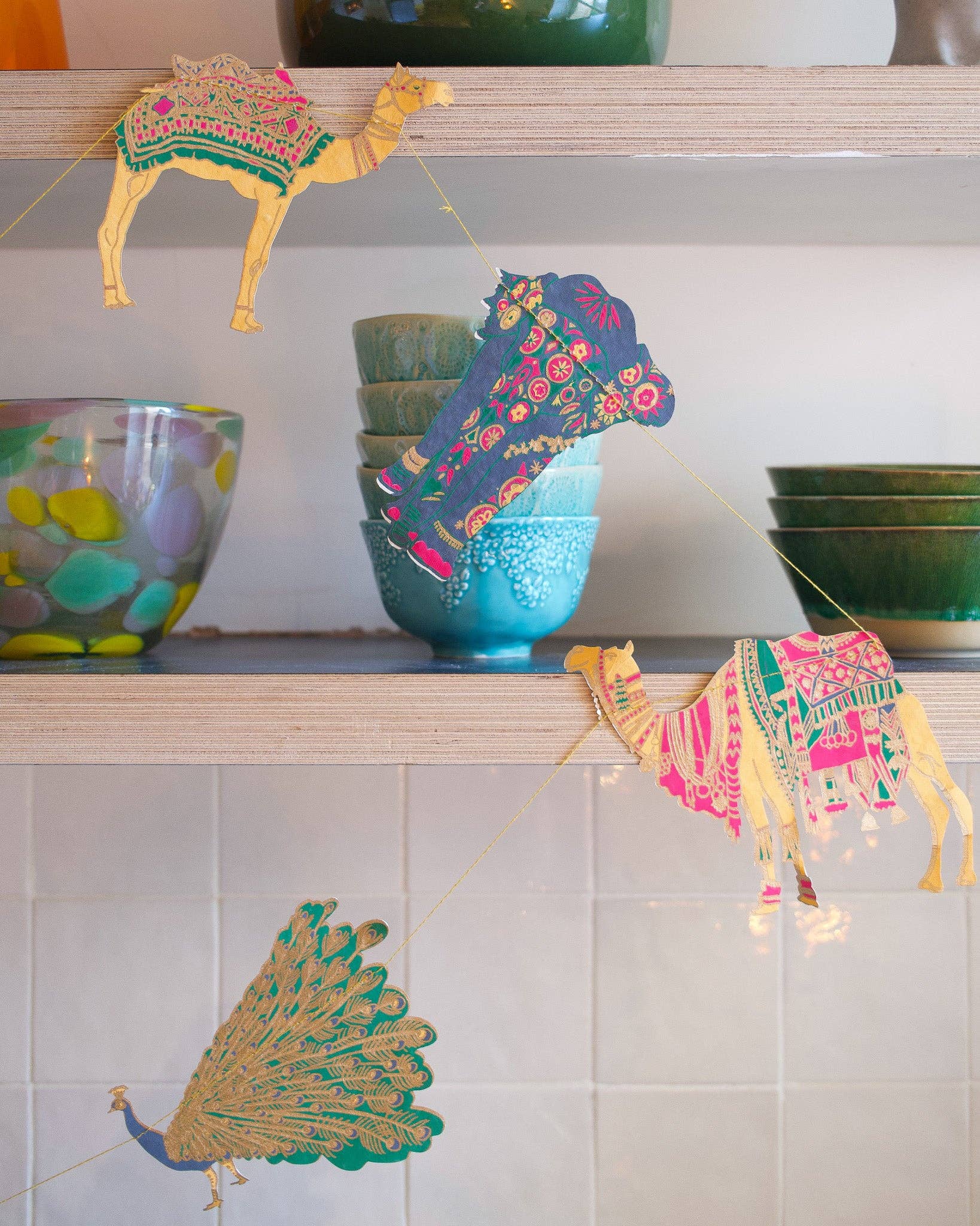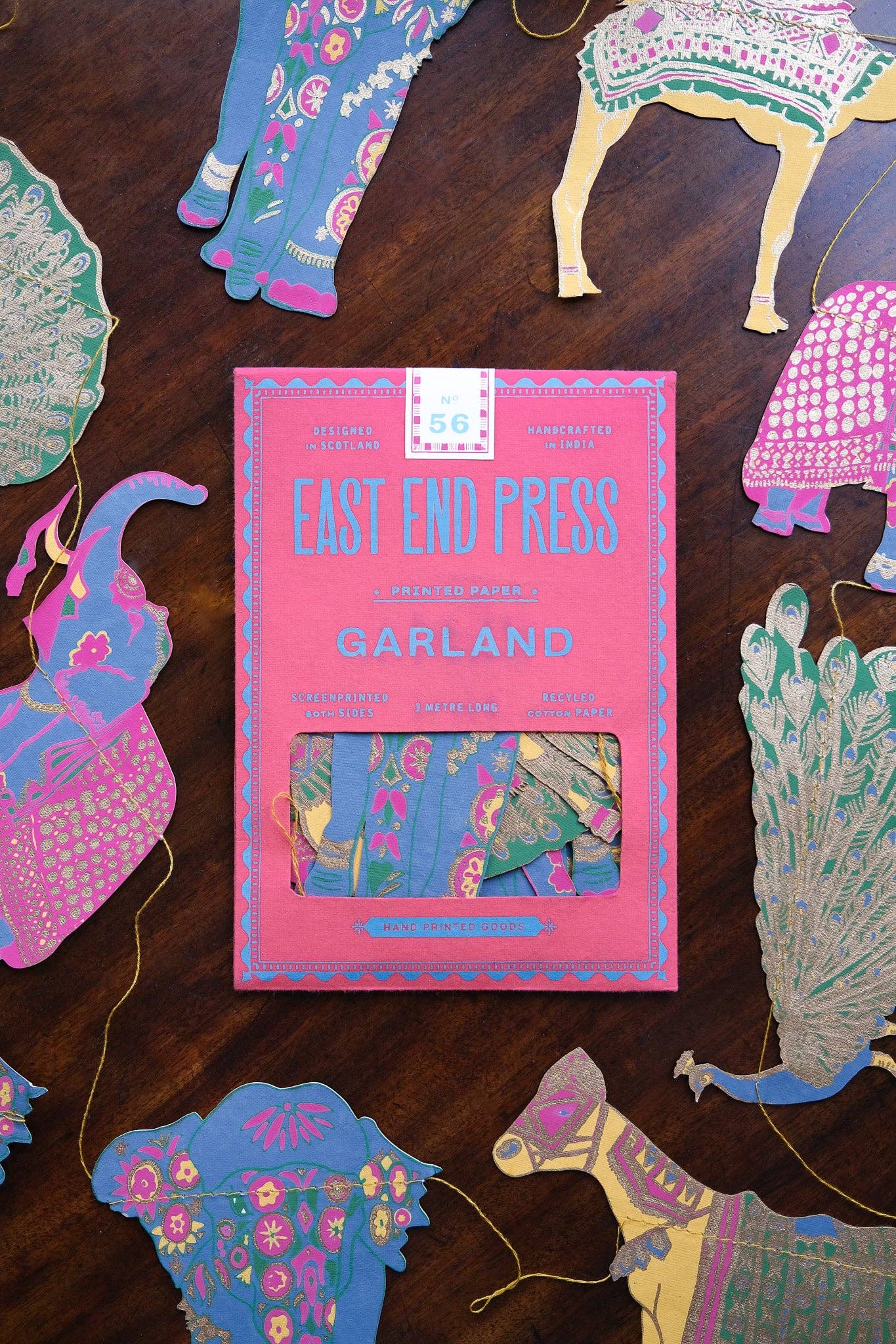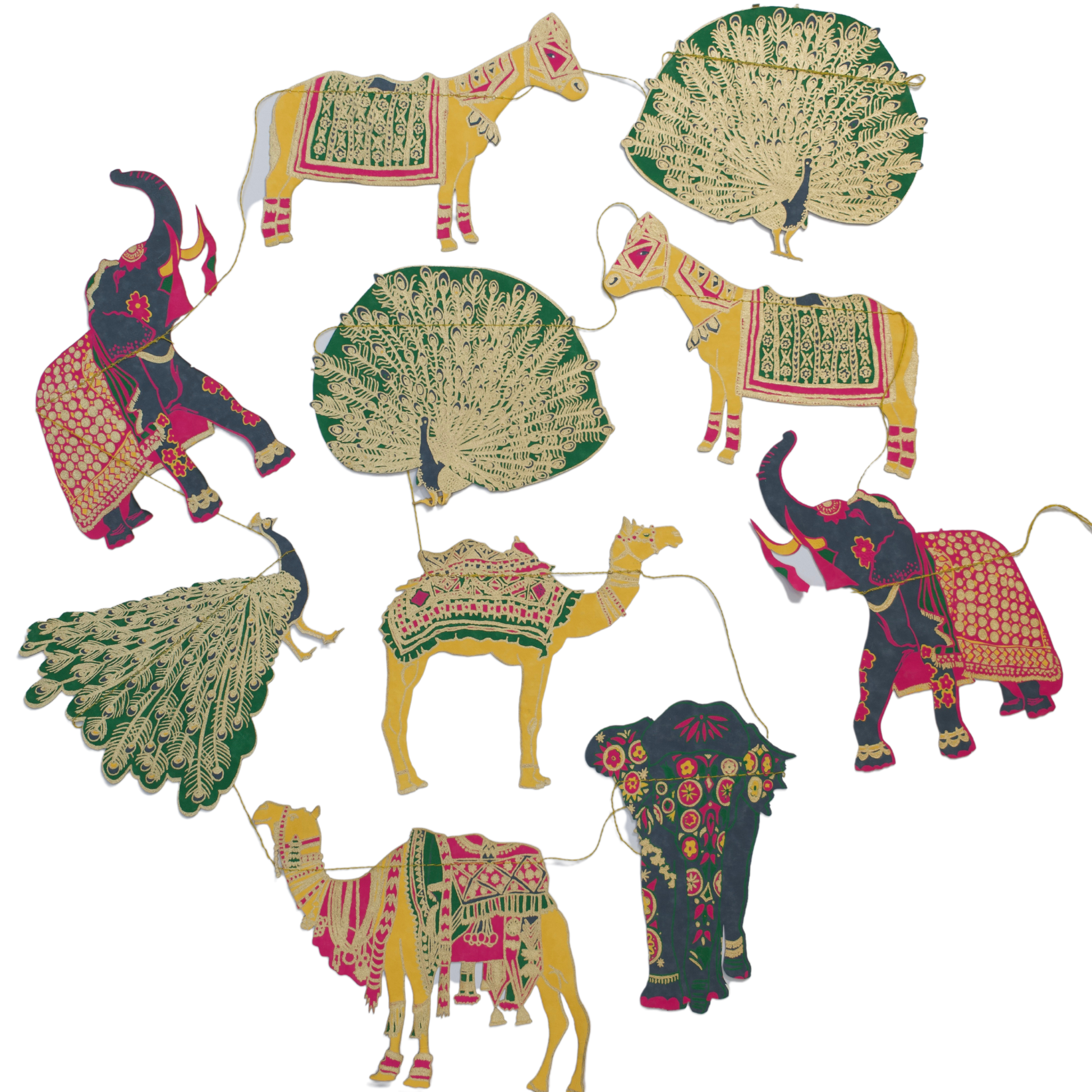 Featuring painted elephants, fancy camels, prancing peacocks and decorated horses; this garland is a menagerie of beautiful Indian animals. Minimum order: 6 - 3 metres long - Includes 10 paper shapes, sewn along strong cotton thread - Screen printed by hand on both sides by talented artisans in Jaipur - Sustainably made from recycled materials.