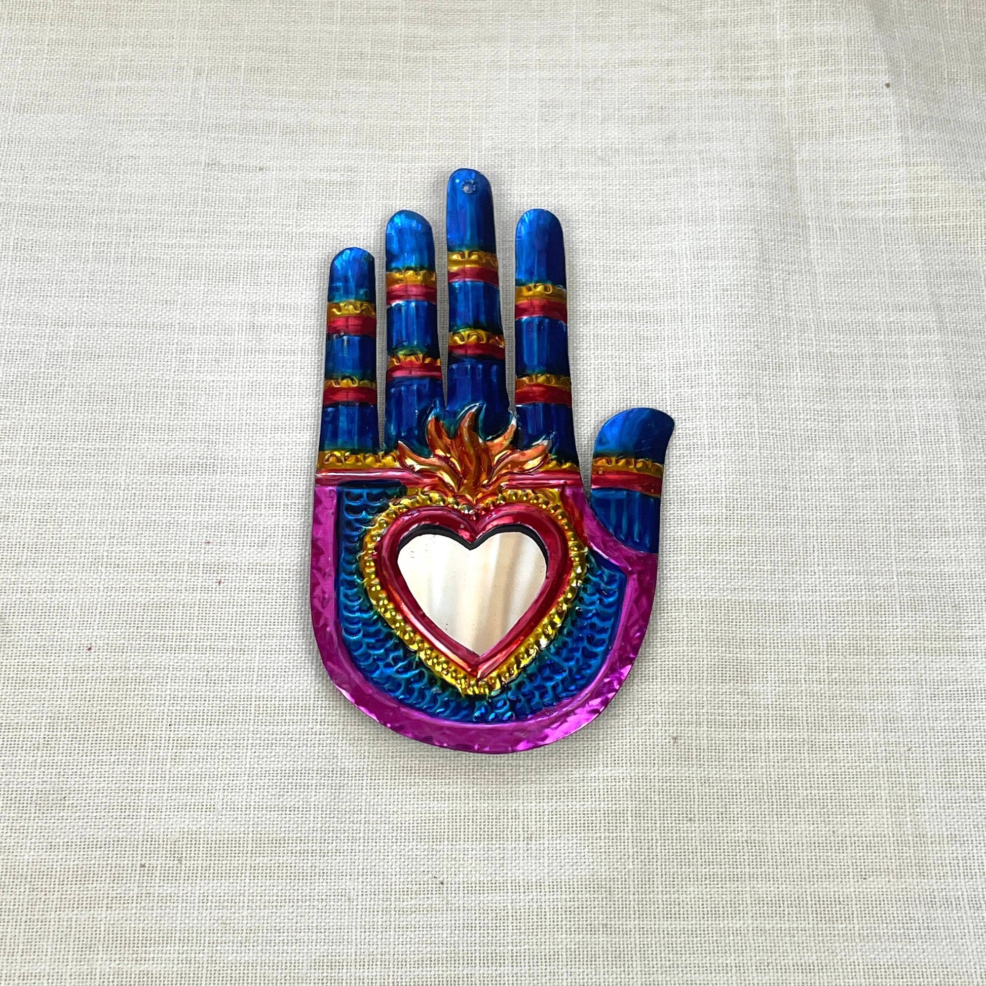 A folk art classic reimagined with playful charm. This tin mirror features an embossed hand cradling a sacred heart — a powerful symbol of love, protection & devotion. Hand-formed and painted in bold, joyful colours, each one is slightly different and full of personality.