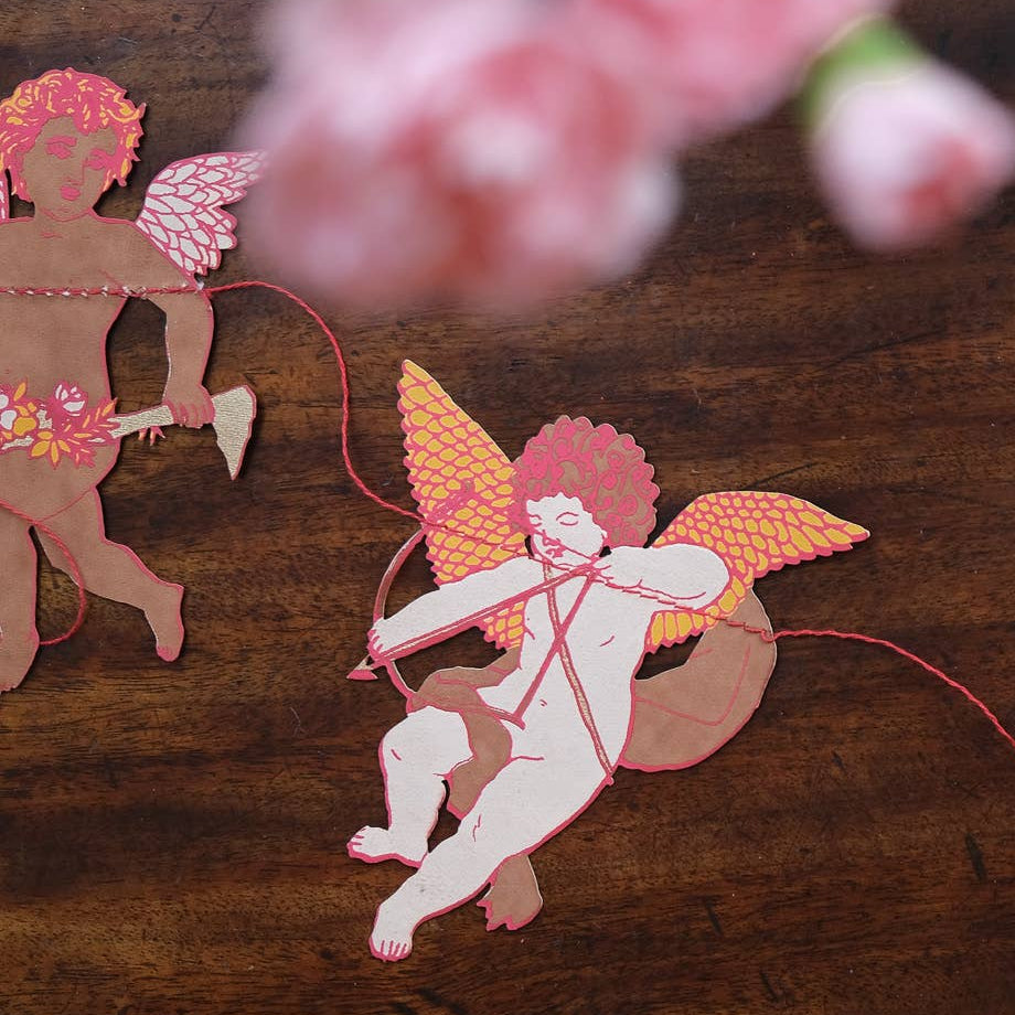 Sixteen angelic cupids are flying along this garland, ready to shoot their arrows at unsuspecting victims. 3 metres long - Includes 10 paper shapes, sewn along strong cotton thread - Screen printed by hand on both sides by talented artisans in Jaipur - Sustainably made from recycled materials.