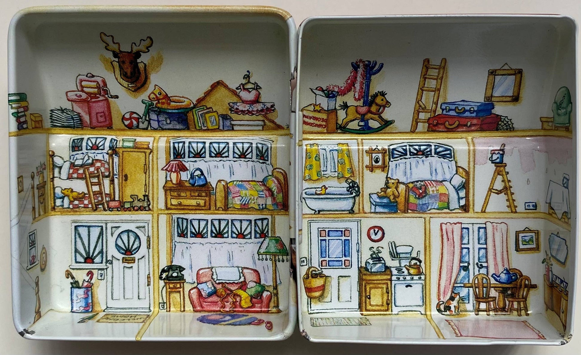 Embrace the joy of nostalgia with the Dolls House with artwork by Dana Kubick. Filled with fruit drops this enchanting tin is perfect for both children's and adults, making it a delightful treat for any occasion. Tin measurement: 65 x 55 x 35mm. Filled weight: 25gm.