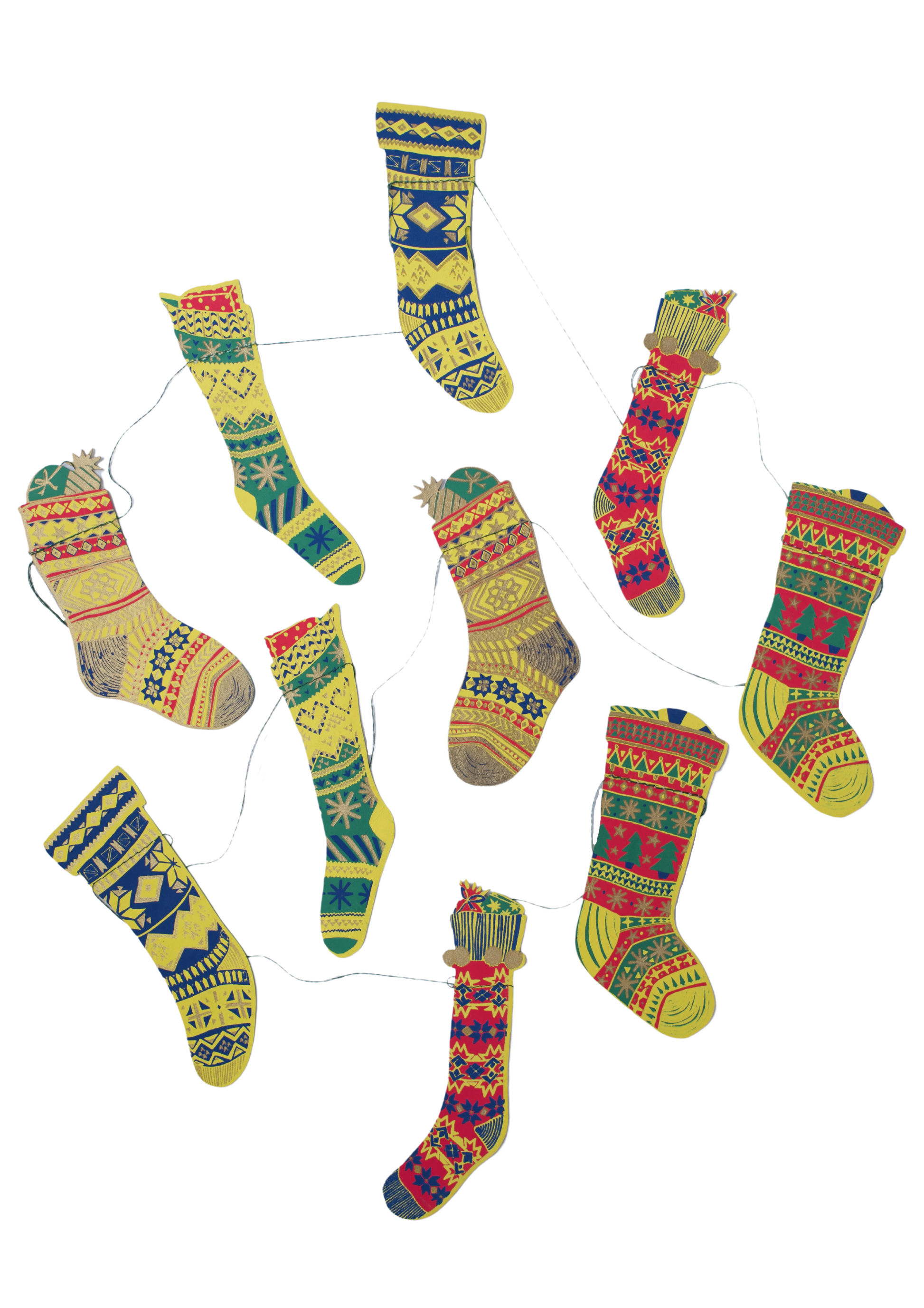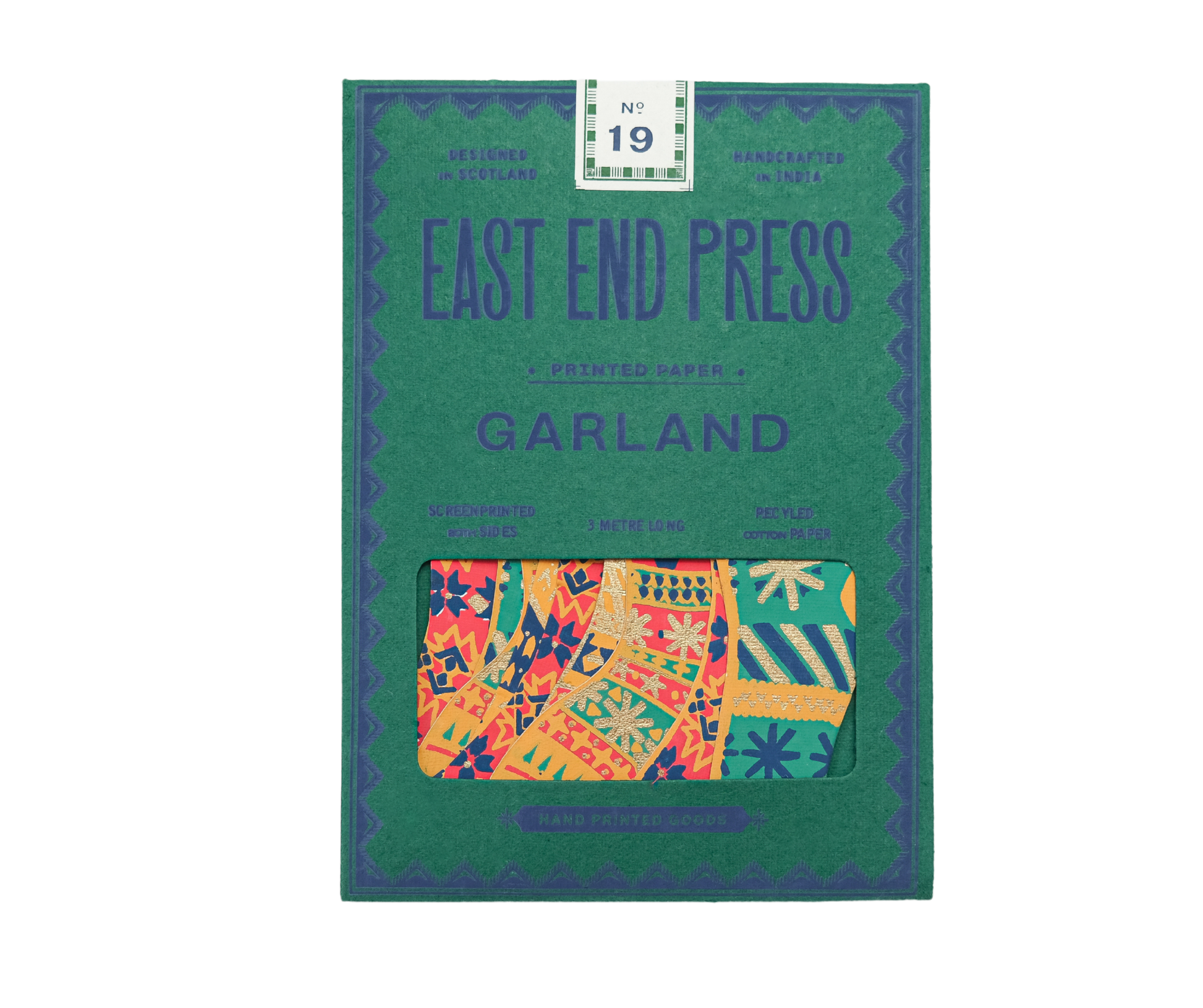 Perfect for hanging along your mantel mantelpiece as you wait for Father Christmas, this garland has ten patterned festive stocking strung along the three metre length. Minimum order: 6 - 3 metres long - Includes 10 paper shapes, sewn along strong cotton thread - Screen printed by hand on both sides by talented artisans in Jaipur - Sustainably made from recycled materials