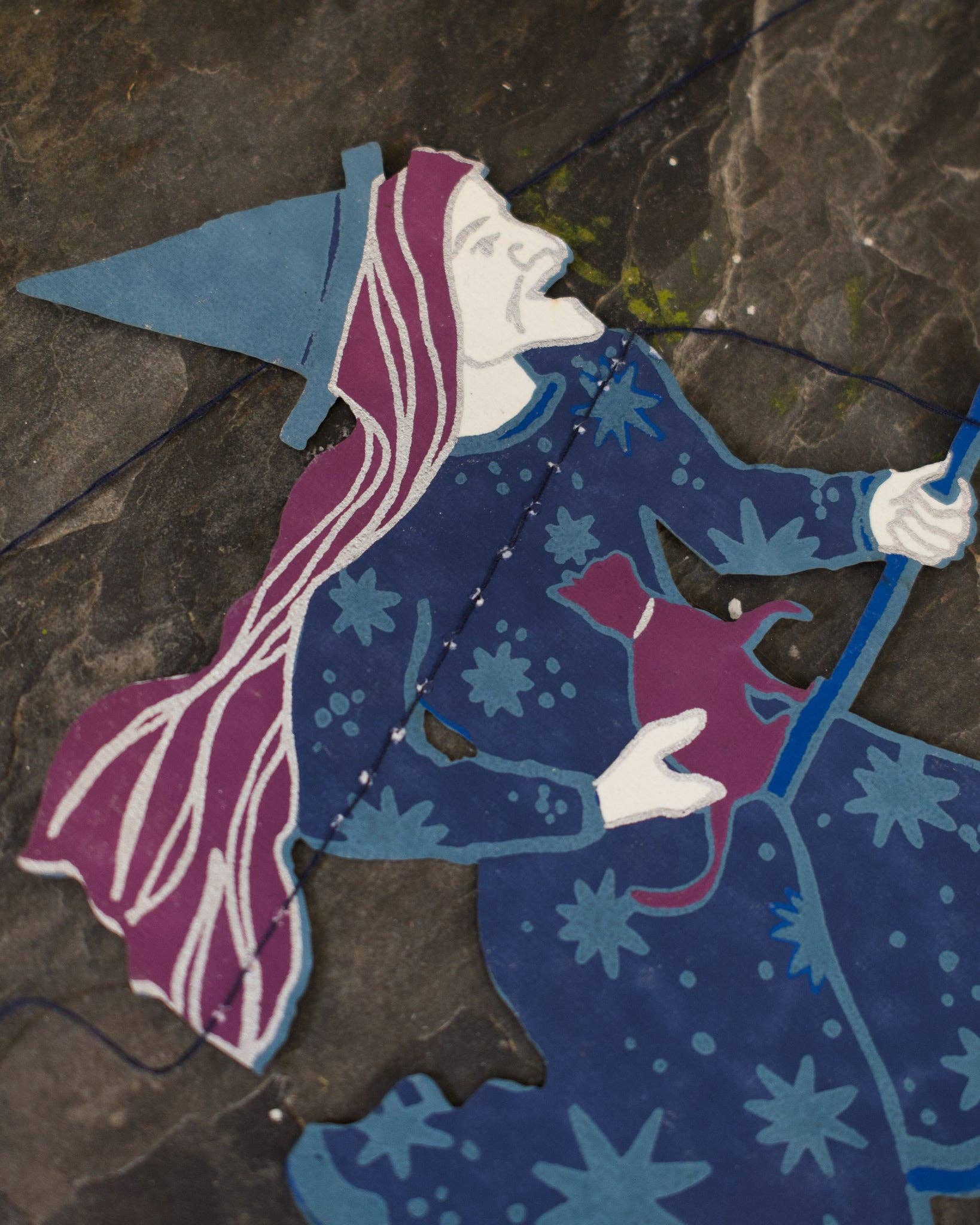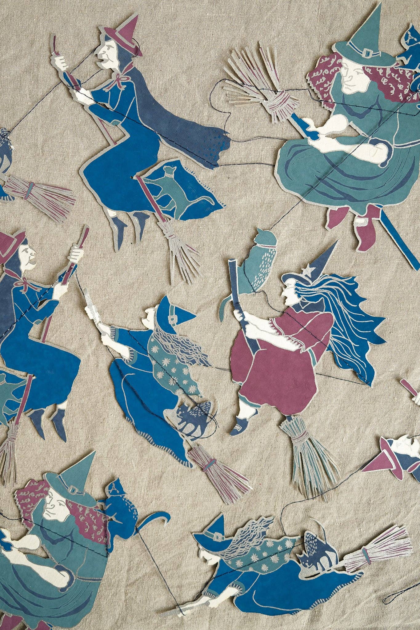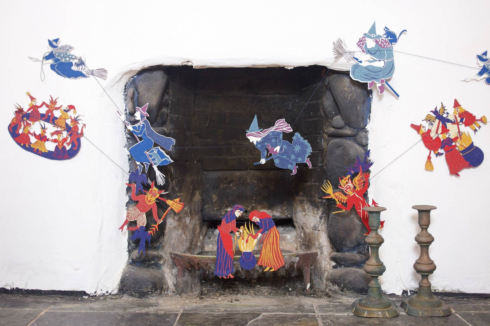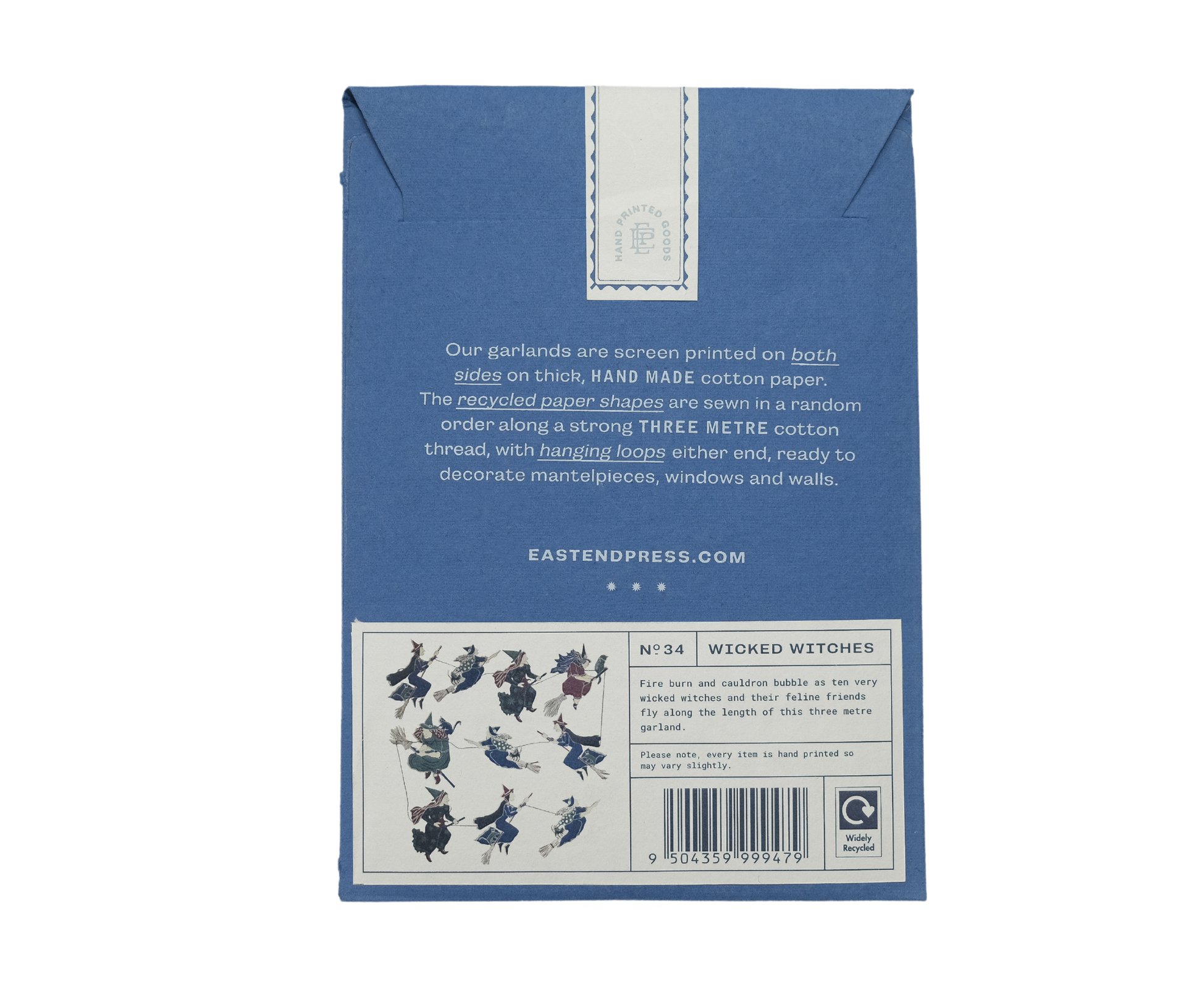 Bring a touch of mischief and magic to your space with this 3-metre garland, featuring ten wicked witches and their feline companions. Designed in Glasgow and made in India from recycled paper pulp, this hand-crafted garland is perfect for Halloween parties, seasonal décor, or just a whimsical display. Each garland adds a playful, festive vibe to walls, mantels, or doorways.